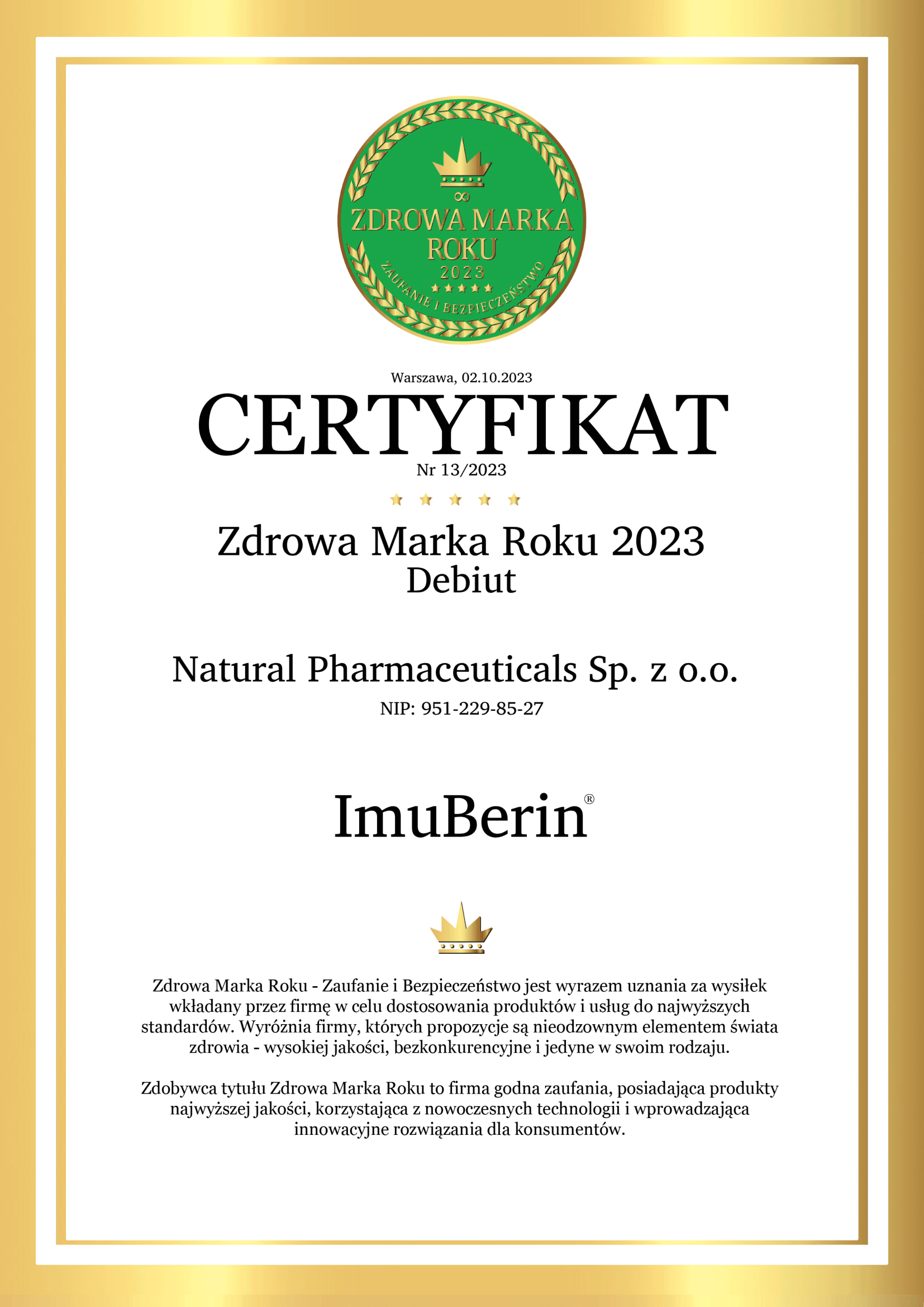 Az Év Egészséges Márkája* egy lengyel projekt, amely értékeli és népszerűsíti a piacon fellelhető legjobb márkákat, melyek a legmagasabb minőségű termékeket, szolgáltatást és megoldásokat kínálják az egészség és az egészséges életmód szem előtt tartásával. Örömmel jelentjük be, hogy az ImuBerin® megkapta a 2023-as Év Egészséges Márkája címet az Újdonság kategóriában Lengyelországban.